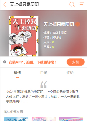 天上掉只鬼叨叨 2025-07-18 04:33 开始阅读 微信阅读 简介: 漫画《天上掉只鬼叨叨》讲述了有一个世界大家都不知道,他的名字叫做鬼画符。哪里生活的都是鬼魂,但是没想到一直安心在哪里生活的鬼叨叨。在上厕所的时候,居然就落入了人类的世界!!!还遇见了一位小道士?!!这个小道士的本领还是不错的,所以,鬼叨叨与他的故事开展了,一人与一鬼的刁蛮故事就开始了哟~~~ The End 标签:韩国漫画