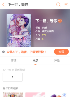 简介: 漫画《下一世,等你》讲诉了三百年前的爱恨情仇,让江慕夏与任骏天擦肩而过!三百年后的再次相遇,她会喜欢浪荡不羁的霸道总裁,还是行侠仗义的他?