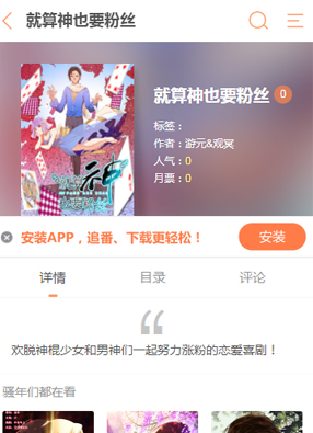 简介:漫画《就算神也要粉丝》简述:听说现在的网红世界里面,粉丝是重要的一件事情!于是涨粉也是一个重要的操作守则!没想到的是,神仙居然也开始了想要涨粉的操作!一个是可爱萝莉的神棍少女,一个是高冷帅气男神,他们之间的故事开始了!他们开始一起努力涨粉丝的恋爱喜剧!
